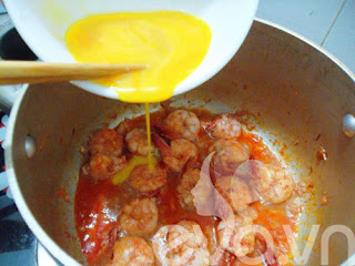 Bước 6: Cho bát trứng đánh tan vào nồi tôm và đảo đều cho phần trứng bám vào tôm.